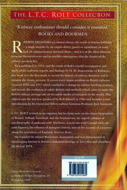 Railway disasters are almost always the result of human fallibility - a single mistake by an engine-driver, guard or signalman, or some lack of communication between them - and it is in the short distance between the trivial error and its terrible consequence that the drama of the railway accident lies. First published in 1955, and the result of Rolt's careful investigation and study of the verbatim reports and findings by H. M. Inspectorate of Railways, this book was the first work to record the history of railway disasters, and it remains the classic account. It covers every major accident on British railways between 1840 and 1957 which resulted in a change in railway working practice, and reveals the evolution of safety devices and methods which came to make the British railway carriage one of the safest modes of transport in the world. This edition uses the last text produced by Rolt himself in 1966 and includes a new introduction by his friend and fellow railway historian Professor Jack Simmons.