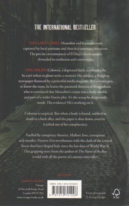 1945, Lake Como. Mussolini and his mistress are captured by local partisans and shot in a summary execution. The precise circumstances of Il Duceâe(tm)s death remain shrouded in confusion and controversy. 1992, Milan. Colonna, a depressed writer picking up hack work, is offered a fee he canâe(tm)t refuse to ghost-write a memoir. His subject: a fledgling newspaper, which happens to be financed by a powerful media magnate. As Colonna gets to know the team of journalists, he learns the paranoid theories of Braggadocio who is convinced that Mussoliniâe(tm)s corpse was a body-double and part of a wider Fascist plot. Itâe(tm)s the scoop he desperately needs. The evidence? Heâe(tm)s working on it. Colonna is sceptical. But when a body is found, stabbed to death in a back alley and the paper is shut down, even he is jolted out of his complacency. Fuelled by media hoaxes, Mafiosi, love, gossip and murder, NUMERO ZERO reverberates with the clash of the cynical forces that have shaped Italy since the last days of World War II. This gripping story from the author of THE NAME OF THE ROSE is told with all the power of a master storyteller.