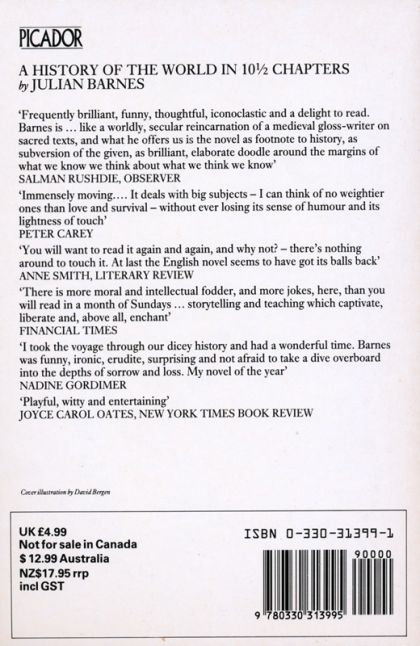Beginning with an unlikely stowaway's account of life on board Noah's Ark, A History of the World in 10½ Chapters presents a surprising, subversive, fictional history of earth told from several kaleidoscopic perspectives. Noah disembarks from his ark but he and his Voyage are not forgotten: they are revisited in on other centuries and other climes - by a Victorian spinster mourning her father, by an American astronaut on an obsessive personal mission. We journey to the Titanic, to the Amazon, to the raft of the Medusa, and to an ecclesiastical court in medieval France where a bizarre case is about to begin...This is no ordinary history, but something stranger, a challenge and a delight for the reader's imagination. Ambitious yet accessible, witty and playfully serious, this is the work of a brilliant novelist.