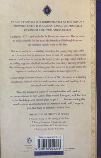 The exquisitely-researched standalone prequel series to Dorothy Dunnett's revered Lymond Chronicles, following the ancestors of Francis Crawford of Lymond in Continental Europe.Gemini is Book Eight in The House of Niccolo series. ----------------------------- 'Landing in Berwick that wild, February day, Nicholas de Fleury had known that he was mad to come back to Scotland, but that it had to be done.'The winter of 1477 is coming to a close as Nicholas, his fortunes restored, returns to the country he nearly ruined to make amends and to settle old scores - and is immediately set upon by assassins. Yet it is not long before he is established at the court of King James III, using his wits and wiles to help steer the kingdom through the storms of trade and war ravaging the continent. With his wife Gelis once more by his side, Nicholas knows a reckoning must be made with his estranged family as the final loose strands of his story entwine together in the concluding volume of the House of Niccolo. 'An extraordinary achievement' Daily Telegraph