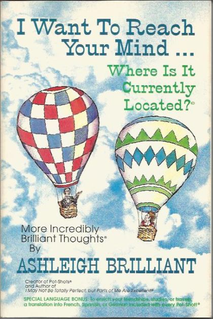 A dazzling collection of witty and wise Pot Shots, or Brilliant Thoughts . . . illustrated epigrams that will inspire your personal quest for telling communication. Fresh, funny, wistful, bright; they may well reflect some of your own deep or whimsical thoughts.Ashleigh's Pot Shots are acclaimed, told and re-told, by young and old, secular and religious, mainstream and offbeat they speak to everyone.What they say: Clifton Fadiman: Most enjoyable; Isaac Asimov: Good one-liners; Richard Armour: Wise, and witty; People magazine: Artistic trailblazer, Ashleigh Brilliant coins epigrams that would drive Oscar wild.Ashleigh's Pot Shots are copyrighted and the names Pot Shots and Brilliant Thoughts are registered trademarks.