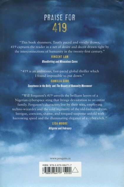 From internationally bestselling travel writer Will Ferguson, author of "Happiness " and "Spanish Fly," comes a novel both epic in its sweep and intimate in its portrayal of human endurance. A car tumbles through darkness down a snowy ravine. A woman without a name walks out of a dust storm in sub-Saharan Africa. And in the seething heat of Lagos City, a criminal cartel scours the Internet, looking for victims. Lives intersect. Worlds collide. And it all begins with a single email: "Dear Sir, I am the daughter of a Nigerian diplomat, and I need your help " Will Ferguson takes readers deep into the labyrinth of lies that is 419, the world s most insidious Internet scam. When Laura Curtis, a lonely editor in a cold northern city, discovers that her father has died because of one such swindle, she sets out to track down and corner her father s killer. It is a dangerous game she s playing, however, and the stakes are higher than she can ever imagine. Woven into Laura s journey is a mysterious woman from the African Sahel with scars etched into her skin and a young man who finds himself caught up in a web of violence and deceit. And running through it, a dying father s final words: "You, I love." "