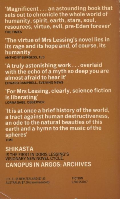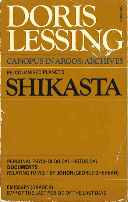 This is the first volume in the series of novels Doris Lessing calls collectively Canopus in Argos: Archives. Presented as a compilation of documents, reports, letters, speeches and journal entries, this purports to be a general study of the planet Shikasta–clearly the planet Earth–to be used by history students of the higher planet Canopus and to be stored in the Canopian archives. For eons, galactic empires have struggled against one another, and Shikasta is one of the main battlegrounds.Johar, an emissary from Canopus and the primary contributor to the archives, visits Shikasta over the millennia from the time of the giants and the biblical great flood up to the present. With every visit he tries to distract Shikastans from the evil influences of the planet Shammat but notes with dismay the ever-growing chaos and destruction of Shikasta as its people hurl themselves towards World War III and annihilation.