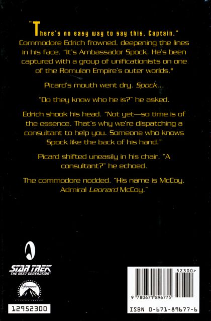 Once a violent, primitive race, Vulcans renounced brutality and their warlike nature for logic. But a small faction established the Romulan Empire, where the old Vulcan way flourished. Now, deep in Romulan territory, an underground movement to reunite the worlds of common ancestry but conflicting ideologies is underway - a reunion some have waited a lifetime to see and others would give their lives to stop. Continuing the mission he began in "Unification", Starfleet Ambassador Spock endeavors to impart the logic of the Vulcan way to a small band of Romulans eager to unite the Romulan Empire and the planet Vulcan. But unbeknownst to them, a Romulan spy has joined the ranks disguised as a Unification sympathizer. Deceived by this traitor, Spock and his students are taken hostage. Fearful that Spock's knowledge of Federation security will fall into enemy hands, Starfleet dispatches its best ship, the U.S.S. Enterprise 1701-D, and most respected captain, Jean-Luc Picard, to secure the hostages' release. Spock's former shipmate from the original Starship Enterprise, Ambassador McCoy - more than one hundred forty years old, but still as feisty as ever - is brought in to consult on the negotiations. Their situation is further complicated when Captain Montgomery Scott confiscates an out-of-service starship and effects his own daring rescue of Spock. Picard must now find a way to preserve the Federation's security and prevent a war while treading a minefield of danger and deadly Romulan politics that threaten his ship, his crew, and the Federation he serves.
