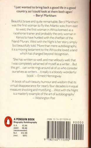 A new edition of a great, underappreciated classic of our time Beryl Markham's "West with the Night "is a true classic, a book that deserves the same acclaim and readership as the work of her contemporaries Ernest Hemingway, Antoine de Saint-Exupery, and Isak Dinesen. If the first responsibility of a memoirist is to lead a life worth writing about, Markham succeeded beyond all measure. Born Beryl Clutterbuck in the middle of England, she and her father moved to Kenya when she was a girl, and she grew up with a zebra for a pet; horses for friends; baboons, lions, and gazelles for neighbors. She made money by scouting elephants from a tiny plane. And she would spend most of the rest of her life in East Africa as an adventurer, a racehorse trainer, and an aviatrix--she became the first person to fly nonstop from Europe to America, the first woman to fly solo east to west across the Atlantic. Hers was indisputably a life full of adventure and beauty. And then there is the writing. When Hemingway read Markham's book, he wrote to his editor, Maxwell Perkins: "She has written so well, and marvelously well, that I was completely ashamed of myself as a writer . . . She] can write rings around all of us who consider ourselves as writers . . . It is really a bloody wonderful book." With a new introduction by Sara Wheeler--one of Markham's few legitimate literary heirs--"West with the Night "should once again take its place as one of the world's great adventure stories.