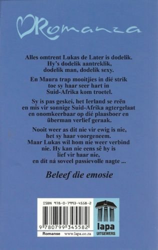Alles omtrent Lukas de Later is dodelik. Hy's dodelik aantreklik., dodelik man, dodelik sexy. En Mantra trap mooitjies in die strik toe sy haar seer hart in Suid Afrika kom troetel. Sy is pas geskei, het Ierland se reën en mis vir sonnige Suid-Afrika agtergelaat en onomkeerbaar op dié plaasboer en uberman verlief geraak. Nooit weer as dit nie vir ewit is nie, het sy haar voorgeneem. Maar Lukas wil hom nie weer verbind nie. Hy kan nie eens sê hy is lief vir haar nie, en dit na soveel passievolle nagte...