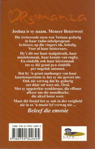 Joshua is sy naam. Meneer Beterweet Die irriterende stem wat Tatiana gedurig in haar radio-inbelprogram kritiseer, op die vingers tik, beledig. Voor al haar luisteraars. Hy't dit oor haar taalgebruik, haar musieksmaak, haar kennis van rugby. En eindelik ook haar kleresmaak toe sy die groot pyn eindelik per ongeluk ontmoet. Dat hy 'n groot aanhanger van haar kunstenaartante is, het sy nie geweet nie. Ook nie verwag dat hy gedurig net daar sal wees nie. Oral. Met sy opgetrekte wenkbroue, die effense afkeer om die mondhoeke, die altyd beter weet. Maar die fossiel het sy ook in der ewigheid nie in so 'n mooie lyf verwag nie ...
