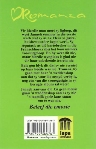 Vir hierdie man moet sy ligloop, dit weet Janneli sommer in die eerste week wat sy as Le Fleur se gastehuisbestuurder begin werk. Sy reputasie as dié hartebreker in die Franschhoekvallei het hom immers vooruitgeloop. En hy weet dit nie, maar hierdie wynplaas is glad nie vir haar onbekende terrein nie. Baie gou blyk dit dat sy nie verniet op haar hoede was nie. Trouens, hy gaan met haar 'n weddenskap aan dat sy voor die oestyd verby is, nog een van die vrouegesigte in sy berugte album sal wees! Janneli aanvaar dit. En geen meisie gaan 'n weddenskap aan as sy nie 'n taamlik goeie kans staan om te wen nie.