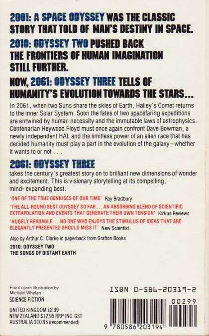 The third book in Clarke's beloved Space Odyssey series, 2061: Odyssey Three returns to Heywood Floyd, survivor of two previous encounters with the mysterious monoliths and the alien intelligences behind them. Floyd is chosen as one of a handful of celebrity guests to witness the first manned touchdown on the surface of Halley's Comet on the privately-owned spaceship Universe. But the touchdown is not fated to go as planned. On Jupiter's moon Europa, which has undergone a transformation after events at the end of 2010: Odyssey Two, scientists have spotted the sudden growth of a gigantic, asymmetrical mountain determined to be one single enormous diamond-a fragment of Jupiter's core. The Universe's sister ship, Galaxy, is hijacked and forced to crash into Europa's ocean-and the Universe is diverted from its original mission to rescue the crew. In this book, Heywood Floyd must once again survive an encounter with HAL, David Bowman, and the mysterious monolith-building race with its own hidden agenda-that will shape the destiny of the human race.