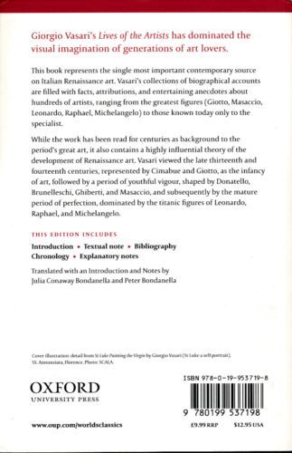 Packed with facts, attributions, and entertaining anecdotes about his contemporaries, Vasari's collection of biographical accounts also presents a highly influential theory of the development of Renaissance art. Beginning with Cimabue and Giotto, who represent the infancy of art, Vasari considers the period of youthful vigour, shaped by Donatello, Brunelleschi, Ghiberti, and Masaccio, before discussing the mature period of perfection, dominated by the titanic figures of Leonardo, Raphael, and Michelangelo. This specially commissioned translation contains thirty-six of the most important lives as well as an introduction and explanatory notes. ABOUT THE SERIES: For over 100 years Oxford World's Classics has made available the widest range of literature from around the globe. Each affordable volume reflects Oxford's commitment to scholarship, providing the most accurate text plus a wealth of other valuable features, including expert introductions by leading authorities, helpful notes to clarify the text, up-to-date bibliographies for further study, and much more.
