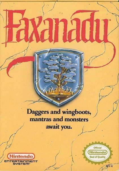 You are the elves' last hope. Outside the town walls lurk monsters with the power to destroy anything in their path. Inside the walls, water and time are running out. Soon the ancient elf town of Eolis will vanish into eternity. Only you can save Eolis. No one else dares to venture beyond the walls, onto the World Tree, where towns and fortresses precariously await the whims of fate at the hands of the Evil. You are searching for the water source and for an antidote to the poison that makes the water undrinkable. To find them you'll need gold and food and magic, speed with a sword... and luck. Every town holds a new mystery, every fortress a new danger. Merchants will sell you magic and valuable tools, but it's up to you to figure out what you need. Long, secret mantras help you slip through the mists, but will you survive the next challenge? This is Faxanadu, the legend, the adventure - the incredible journey on the World Tree!