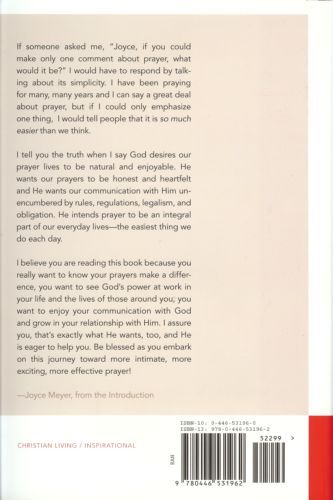 Prayer transforms lives every day.But for those who pray, how manytruly understand its power? In herstraightforward and profound stylebeloved by millions worldwide,Joyce Meyer reveals the incredibleforce that comes through the simpleact of prayer. By explaining thekeys to unanswered prayers, thehindrances to prayer's effectiveness,and the Bible's role in prayer,Joyce gives readers a new perspectiveon how best to communicatewith God. She reveals that throughprayerful conversation comes theability to be successful in life, strong at heart, and sincerewith others. Simple prayer, powerful results.
