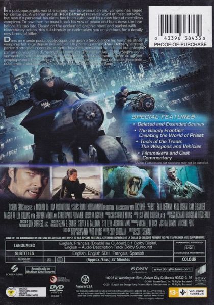 In an alternate world, humanity and vampires have warred for centuries. After the last Vampire War, the veteran Warrior Priest lives in obscurity with other humans inside one of the Church's walled cities. When the Priest's niece is kidnapped by vampires, the Priest breaks his vows to hunt them down. He is accompanied by the niece's boyfriend, who is a wasteland sheriff, and a former Warrior Priestess.