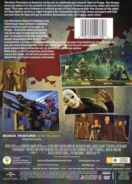 One night per year, the government sanctions a 12-hour period in which citizens can commit any crime they wish -- including murder -- without fear of punishment or imprisonment. Leo, a sergeant who lost his son, plans a vigilante mission of revenge during the mayhem. However, instead of a death-dealing avenger, he becomes the unexpected protector of four innocent strangers who desperately need his help if they are to survive the night.