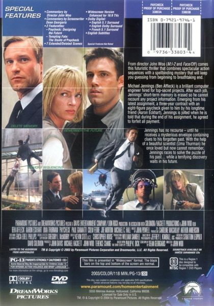 | Extras | Commentary By Director John Woo Commentary By Screenwriter Dean Georgaris # 2 Featurettes: Paycheck: |