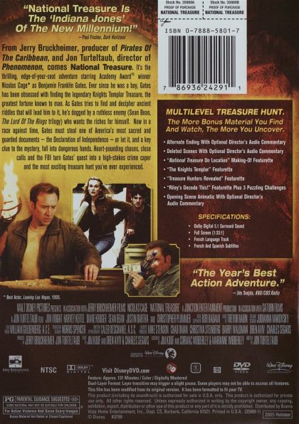 Modern treasure hunters, led by archaeologist Ben Gates, search for a chest of riches rumored to have been stashed away by George Washington, Thomas Jefferson and Benjamin Franklin during the Revolutionary War. The chest's whereabouts may lie in secret clues embedded in the Constitution and the Declaration of Independence, and Gates is in a race to find the gold before his enemies do.