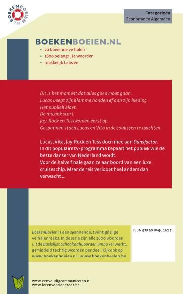Het 20ste en laatste deel in de serie boekenboeien.nl. Bevat schooltaalwoorden economie. Jay-Rock, Tess, Lucas en Vita zijn geselecteerd voor de finale van een grote danswedstrijd. Ze gaan dansen voor een jury op cruiseschip Gigantica. Luca heeft stiekem een oogje op Vita en hij mag met haar de eerste ronde dansen. Iedereen verheugt zich op de danswedstrijd. En dan voltrekt zich een vreselijk drama.