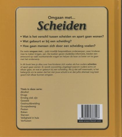 Serie: Omgaan met Scheiden. . Auteur: Patricia J. Murphy. Wat is het verschil tussen scheiden en apart gaan wonen? Wat gebeurt er bij een scheiding? Hoe gaan mensen zich door een scheiding voelen? De reeks omgaan metE pakt moeilijk bespreekbare onderwerpen, waar kinderen mee te maken krijgen, aan. De boeken geven duidelijke informatie, bieden een antwoord op vaak voorkomende vragen en helpen de lezer zo beter om te gaan met het onderwerp. In dit boek lees je alles over hoe kinderen zich voelen als hun ouders scheiden of apart gaan wonen. Er wordt voorzichtig uitgelegd waarom ouders soms uit elkaar gaan, en wat er gebeurt bij een scheiding. Als jij dat zelf meemaakt, is het belangrijk om te weten dat het niet jouw schuld is en dat jullie allemaal nog best goed met elkaar kunnen omgaan.
