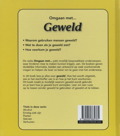 Allerlei aspecten van ruzies en geweld komen aan bod, zoals hoe het wordt uitgelokt, wie er het slachtoffer van is en hoe je het kunt voorkomen. Twee naast elkaar liggende pagina's behandelen telkens een thema, soms aan de hand van een vraag. De teksten, drie tot zes regels per bladzijde, zijn prettig te lezen en bondig. Ze zijn gedrukt in een groot, duidelijk leesbaar lettertype. Belangrijke, wat moeilijkere woorden zijn vetgedrukt en worden in de woordenlijst achterin verklaard. De vele kleurenfoto's van vooral kinderen en jongeren dienen als verduidelijking van een geschetste situatie. De uitgave kan een goed hulpmiddel zijn om het omgaan met ruzies en geweld aan de orde te stellen. De stevige, handzame uitgave sluit af met enige boeken en websites en een register. Maakt deel uit van de serie 'Omgaan met...'*, die emotioneel ingrijpende thema's voor kinderen bespreekbaar en deelbaar maakt. Om zelf te lezen of als aanzet tot gesprek te gebruiken, thuis en op school. Vanaf ca. 9 t/m 11 jaar; ook voor kinderen die moeite hebben met lezen.