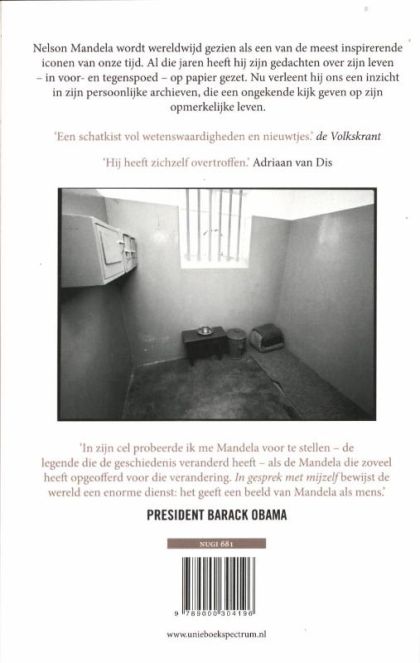 In gesprek met mijzelf is samengesteld uit Mandelas persoonlijke archief. Dit materiaal is nog nooit eerder gepubliceerd: het omvat logboeken van tijdens de strijd tegen de apartheid, dagboeken en brieven uit de tijd van zijn gevangenschap, kladblokjes uit de overgangsperiode na de apartheid, opgenomen privégesprekken en correspondentie uit zijn jaren als president. Een persoonlijke reis van Mandelas eerste politieke bewustwording tot zijn betoverende rol op het toneel van de wereldpolitiek. Het boek verhaalt over een heldhaftig leven aan het front van het gevecht voor vrijheid en gerechtigheid. In gesprek met mijzelf is een persoonlijk verslag, vanaf het eerste ontwaken van Mandelas politieke geweten tot en met zijn glansrol op het wereldtoneel. Het is een zeldzame kans om tijd door te brengen met Nelson Mandela; met hem in contact te komen, in zijn eigen stem: direct, helder en intiem. Het definitieve boek van en over Nelson Mandela. In zijn cel [op Robbeneiland] probeerde ik me Mandela voor te stellen de legende die de geschiedenis heeft veranderd als de Mandela die zoveel heeft opgeofferd voor die verandering. In gesprek met mijzelf bewijst de wereld een enorme dienst: het geeft een beeld van Mandela als mens. - President Barack Obama een schatkist vol wetenswaardigheden en nieuwtjes over de anti-apartheidsstrijder die uitgroeide tot icoon. - de Volkskrant Nelson Mandela is geboren in Transkei, Zuid-Afrika, op 18 juli 1918. Hij werd lid van het African National Congress (ANC) in 1944 en hij was vanaf 1948 een van de leiders in de opstand tegen het apartheidsbewind. In 1962 werd hij gearresteerd, waarna 27 jaar gevangenschap volgde. In die tijd groeide zijn status als symbool van de strijd tegen de apartheid. Mandela kreeg in 1993 de Nobelprijs voor de vrede en werd in 1994 de eerste democratisch gekozen president van Zuid-Afrika.