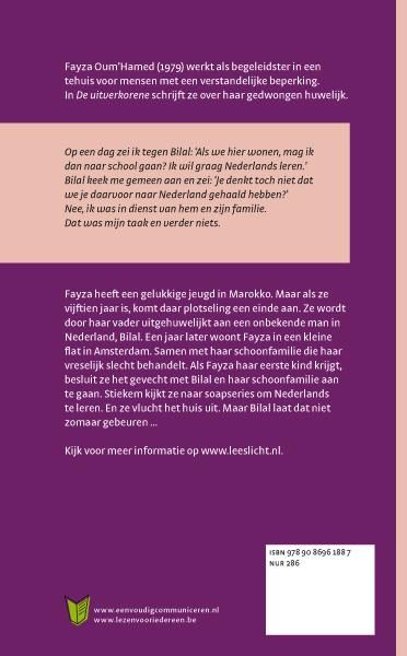 De Marokkaanse Fayza (1979) vertelt dat ze van haar vader moest trouwen met een onbekende man uit Nederland. Hij en zijn familie mishandelen en vernederen haar. Verhaal in korte zinnen en gemakkelijke woorden. Vanaf ca. 15 jaar.