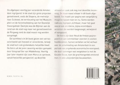 Fotografie Ger en Marco van Middelkoop Tekst Noud de Vreeze De afgelopen veertig jaar veranderde Amsterdam ingrijpend. In de binnenstad zijn grote projecten gerealiseerd, zoals de Stopera, de metrolijn naar Zuidoost en de IJ-oeverprojecten. Aan de rand van de stad was de Bijlmer nog maar net gerealiseerd en de Ringweg rond de stad moest nog worden aangelegd. Nu is de Bijlmer alweer voor een groot deel gesloopt en de Ringweg verdwijnt op allerlei plaatsen onder kantoorkolossen. De luchtfoto's in dit boek geven een verrassend beeld van hoeveel er veranderde, terwijl de stad toch ook hetzelfde bleef. De foto's uit de jaren zeventig werden gemaakt door Ger van Middelkoop; veertig jaar later maakte zijn zoon Marco ze nog een keer, vanuit hetzelfde perspectief, op dezelfde afstand en vaak ook nog met dezelfde bezonning. Soms worden radicale ingrepen zichtbaar, maar het gaat ook vooral om kleine, bijna onzichtbare accenten die werden toegevoegd, verwijderd of aangepast. De foto's zijn door Noud de Vreeze gegroepeerd en van commentaar voorzien in zestien hoofdstukken, die samen een verhaal over de ontwikkeling van Amsterdam vertellen in een periode die wel de Tweede Gouden Eeuw van Amsterdam is genoemd. Het was een periode van economische voorspoed waardoor ambitieuze politici en ambtelijke diensten met een ongekend elan konden werken aan de ontwikkeling van de stad.