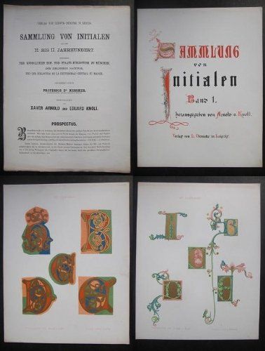 Leipzig: Ludwig Denicke, [1867]. First edition. Hard cover. Good/First volume of a projected five-volume series on decorated initials from Medieval and Early Modern manuscripts. Examples date from the 12th to the 16th centuries, reproduced by palaeographer Xaver Arnold and calligrapher Edouard Knoll. Impressive printing by Ludwig Denicke. In spite of the appeal for subscribers in the prospectus, the project for further volumes remained unrealized. A second edition was published at the end of the century. We know of no other surviving example of the prospectus.. 35 cm; [2],[2], and 30 color lithograph plates, including title page. Collation includes (truncated)