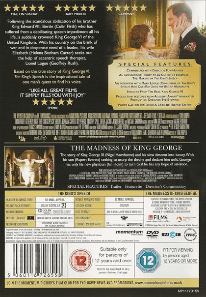 The King’s Speech is het waargebeurde verhaal over Koning George VI, die om zijn stotterproblemen te overwinnen les kreeg van eigenzinnig logopedist Lionel Logue. Direct na het overlijden van zijn vader en het oneervolle aftreden van zijn broer Edward, wordt Bertie, die al zijn hele leven een ernstig stotterprobleem heeft, gekroond tot Koning George VI van Engeland. Engeland staat op dat moment aan de vooravond van de Tweede Wereldoorlog. Zijn vrouw Elizabeth besluit contact te zoeken met de excentrieke Lionel. Ondanks een wat moeilijke start lijkt Lionel’s onorthodoxe methode zijn vruchten af te werpen: de Koning ontwikkelt niet alleen het vertrouwen in zijn stem om het volk toe te spreken, ook ontstaat er een onverwachte, maar hechte vriendschap tussen George en Lionel.