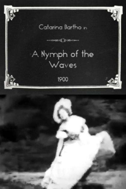 A woman in ballet slippers wearing a large white hat and a long white dress - with ruffles, puffy sleeves and petticoats - dances across water with roiling waves behind her. She holds the edges of the skirt with her hands, lifting and twirling, sometimes exposing her bloomers and a dark garter on one leg...