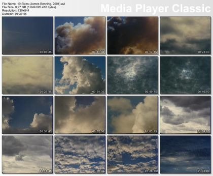 James Benning's Ten Skies consists of ten different shots, each ten minutes long. Each of the shots consists of a straight-on shot of the sky, each sky having very different visual characteristics. The audio consists of the natural sounds heard at each of the locations, providing interesting clues as to where the camera is.