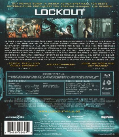 Set in the near future, Lockout follows a falsely convicted ex-government agent (Pearce), whose one chance at obtaining freedom lies in the dangerous mission of rescuing the President's daughter (Grace) from rioting convicts at an outer space maximum security prison.