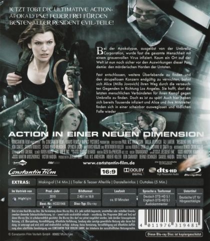 In a world ravaged by a virus infection, turning its victims into the Undead, Alice (Jovovich), continues on her journey to find survivors and lead them to safety. Her deadly battle with the Umbrella Corporation reaches new heights, but Alice gets some unexpected help from an old friend. A new lead that promises a safe haven from the Undead takes them to Los Angeles, but when they arrive the city is overrun by thousands of Undead - and Alice and her comrades are about to step into a deadly trap.