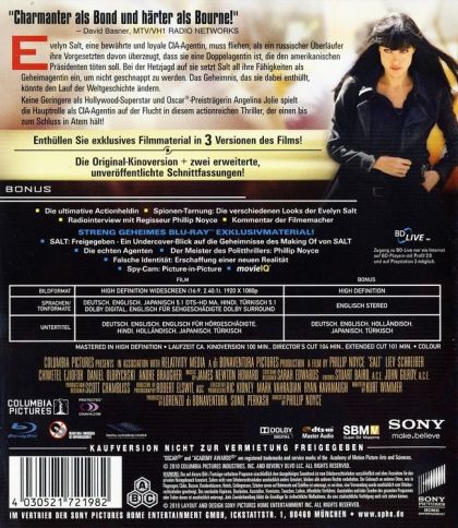 As a CIA officer, Evelyn Salt swore an oath to duty, honor and country. Her loyalty will be tested when a Russian defector accuses her of being a Russian sleeper spy. She goes on the run, using all her skills and years of experience as a covert operative to elude capture, protect her husband, and stay one step ahead of her colleagues at the CIA. Her efforts to prove her innocence only serve to cast doubt on her motives, as the hunt to uncover the truth behind her identity continues and the question remains: "Who is Salt?"