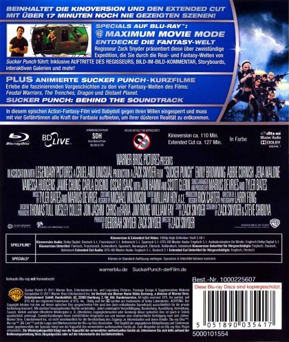 Sucker Punch is a 2011 action-fantasy thriller film, about the fantasies of a young woman who is committed to a mental institution. It was written by Steve Shibuya and Zack Snyder and directed by Snyder. The film features an ensemble cast starring Emily Browning as the central character (Babydoll)and Abbie Cornish as the second main character (Sweet Pea), as well as Oscar Isaac (Blue).The film was released in both conventional and IMAX theatres in the US at midnight on March 25, 2011.A young girl is institutionalized by her wicked stepfather. Retreating to an alternative reality as a coping strategy, she envisions a plan which will help her escape from the facility.