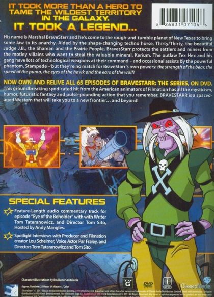 The discovery of Kerium, a rare and powerful magic crystal, brings an infinite number of colonists from all the corners of the galaxy to the distant planet New Texas. Some are good and honest, others very malicious but no one is more dangerous than Tex Hex the leader of the Carrion Bunch, a group of outlaws under the control of the mysterious group Stampede. Hex seeks to control this immense mineral richness at all costs than is Kerium. Only one person can put a stop on his plans: BraveStarr. When there was an obstacle in the way, BraveStarr called for the power of a particular animal and used that ability to move the obstacle, like using the strength of a bear to move a boulder, or the speed of a puma to catch the criminal, the eyes of a hawk, or the ears of a wolf. To help him in the fight for the cause of justice, he had Thirty-Thirty, his horse that can transform into a human-like creature being able to stand on it's hind legs, talk and fight alongside him. BraveStarr lived in Fort