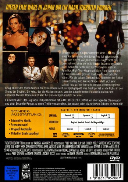 A Los Angeles special liaison officer (Snipes) is called in to investigate the murder of a call-girl in the boardroom of a Japanese corporation. Accompanied by a detective with unusual knowledge of the Japanese culture (Connery), the two men must unravel the mystery behind the murder by entering an underground "shadow world" of futuristic technology, ancient ways and confusing loyalties.