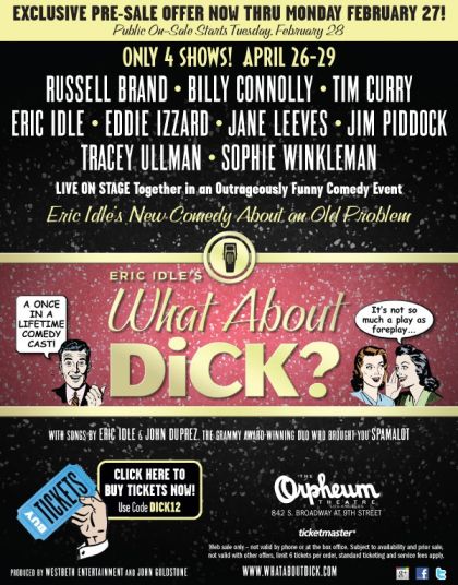 What About Dick? begins with the birth of a sex toy invented in Shagistan in 1898 by Deepak Rushdie Obi Ben Kingsley (Eddie Izzard), and tells the story of the subsequent decline of the British Empire as seen through the eyes of a Piano. The Piano (Eric Idle) narrates the tale of Dick (Russell Brand); his two cousins: Emma, (Jane Leeves) an emotionally retarded English girl; her kleptomaniac sister Helena (Sophie Winkleman) and their dipsomaniac Aunt Maggie (Tracey Ullman) who all live together in a large, rambling, Edwardian novel. When the Reverend Whoopsie (Tim Curry) discovers a piano on a beach, a plot is set afoot that can be solved only by a private Dick, the incomprehensible Scottish sleuth Inspector McGuffin (Billy Connolly) who with the aid of Sergeant Ken Russell (Jim Piddock) finally reveals the identity of the Houndsditch Mutilator.
