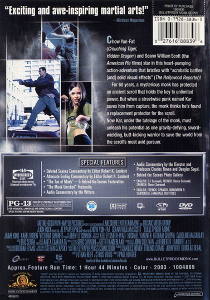 Bulletproof Monk brings traditional martial art into New York City where the current guardian Monk (Chow Yun Fat) of a powerful ancient scroll is looking for his successor. Surprised and full of doubt, he has found his successor Kar (Seann William Scott) who is a charming pickpocket and does not take anything seriously. Running out of time as Monk gets weaker, he and Kar learn and teach from each other while being chased by long time power-monger. Only at the end will you find out who the real successor is and how the mankind is once again, saved. Comical but still have martial art stunts, this movie will bring suspense and joy to the audience.