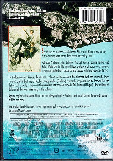 Gabe Walker (Sylvester Stallone) is a rescue climber who loses his cool after a terrible accident ends in the death of his friend and fellow climber's girlfriend. Some time later he is called upon to make another rescue attempt, but it takes a lot of convincing by his girlfriend Jessie (Janine Turner) before he consents to help. Going along with him is his now ex-friend Hal Tucker (Michael Rooker) who is still angry at the death of his girlfriend. The two quickly realize that this is no ordinary rescue however, when the rescue party takes them prisoner. Eric Qualen (John Lithgow) the head of the gang, has recently completed a daring heist of over $100 million in US Treasury funds, but the group had a disagreement leading to the loss of the cases of money and the plane crash. Gabe and his friends undergo a grueling test to try and outwit and outlast the thieves in this intense action movie.