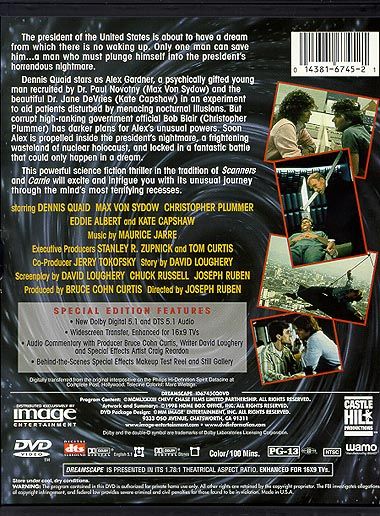 “Dreamscape” is a film about a government agency that uses psychics to peer into people’s dreams. Doctor Paul Novotny (Max von Sydow) seeks out Alex Gardner (Dennis Quaid) who is one of the most powerful psychics he knows of. When on subject dies in her sleep from a heart attack, Alex becomes very suspicious of Tommy Ray (David Patrick Kelly) and another fellow psychic and learns of an attempt to use Tommy to assassinate the President of the United States (Eddie Albert) who has come to the institute for help with his chronic nightmares. A conspiracy that leads back to a man named Bob Blair (Christopher Plummer).