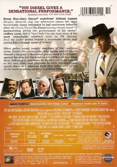 This comedy/courtroom drama is based on the true life events of mobster “Fat Jack” DiNorscio (Vin Diesel) with most of the dialog coming directly from court transcripts. After being sentenced to 30 years on a drug charge Jack’s lawyer (Jerry Adler) sets up a meeting between Jack and the prosecutor Sean Kierney (Linus Roache) to lessen his sentence in exchange for testimony against Nick Calabrese (Alex Rocco) and other members of the crime family in an upcoming RICO case. After turning down the plea he becomes fed up with his attorney’s perceived mishandling of his drug case, fees, and the idea he would set up a deal. Jack decides to defend himself in what would turn out to be the longest running mafia trail in U. S. History, with 20 defendants each with his own lawyer and 76 charges the case lasted 21 months. Jack stumbles around procedure and uses his charm to work the jury. All involved except Jack and Judge Finestein (Ron Silver) want Jack to have a separate trial. Along the way Jackie finds his footing and even manages to win over defense attorney Ben Klandis (Peter Dinklage) while enroute to a non guilty verdict.