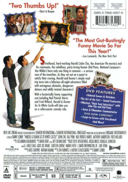 Harold (John Cho) and Kumar (Kal Penn) are two young adult stoners whose desire for White Castle hamburgers to cure their munchies takes them on an outrageous adventure across New Jersey. Harold is a junior investment banker who is constantly stepped on at work because of his Asian ethnicity and quiet nature. Harold has a crush on his neighbor Maria (Paula Garces), but lacks the confidence to approach her. Kumar is the son of a doctor with a predisposition for medical work, but no desire for a career. A night of smoking and watching TV gives Harold and Kumar an insatiable craving for White Castle fast food, but there is no nearby White Castle. The two travel through New Jersey searching for White Castle, but encounter several roadblocks and hijinks along the way.
