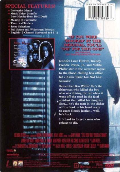 This is a sequel to "I Know What You Did Last Summer". Our main character Julie James (Jennifer Love Hewitt) is going to the Bahamas courtesy of her roommate who wins an all expense paid vacation there. They go together with their boyfriends but a hurricane is coming so all the other guests have left. Weird things start happening, then someone ends up dead. Julie now thinks that the person they killed in the first episode is again after them. A merry chase then happens as the killer goes after each of them and they try to stay one step ahead of him.