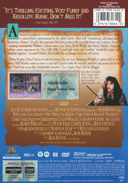 Westly and Buttercup fall in love while he's working on her farm. He goes off to sea to find his fortune so he will feel worthy of her love and therefore able to marry her. Alas, he meets up with Pirate Roberts, the meanest pirate ever to sail the seven seas. Buttercup, upon finding out about Westly's death, no longer has any enthusiasm for life; when an odious prince asks for her hand in marriage she agrees, having no emotion one way or the other, though she has many nightmares about the upcoming nuptials. Before the wedding can happen, however, Buttercup is kidnapped by a giant, a swordsman, and a short, lisping Sicilian. A mysterious man in black attempts to rescue her and we learn that things are not always as they seem, and true love never dies....