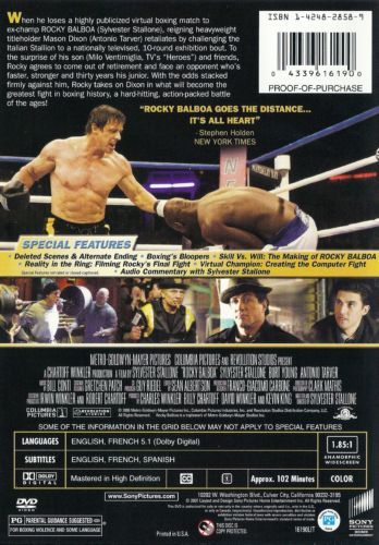 Rocky now lives alone, as his wife Adrian passed away several years ago. His son despises him, and he owns a restaurant, Adrian's, in Philadelphia. Rocky starts thinking about fighting locally, but after a computer simulation shows Rocky beating the current champ, Mason Dixon, Dixon's people challenge Rocky to a fight. After some soul-searching, Rocky agrees, and starts training, since his speed and quickness are gone, Rocky can only win by developing brute strength. He does that, and fights Dixon to the bitter end, with his son in his corner after the two reconcile.