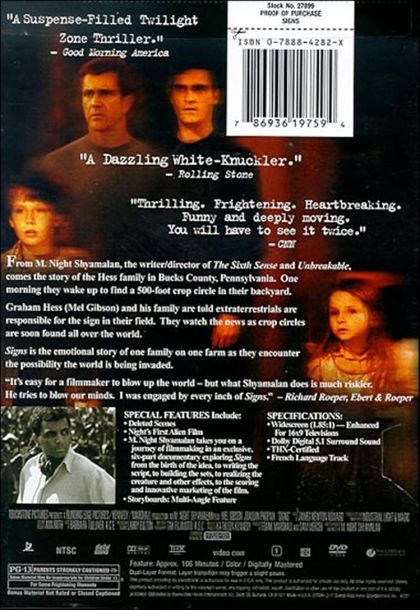 A first rate alien invasion/thriller movie from writer/director M. Night Shyamalan and starring Mel Gibson and Joaquin Phoenix. A former preacher Graham Hess (Gibson) is living in the rural Pennsylvania countryside as a farmer when he starts to experience strange phenomenon after a crop circle is discovered on his farm by his children. Along with his brother Merrill (Phoenix) and his children they begin to realize that an alien force may be preparing to invade the planet. Things may not be as they seem though in a classic Shyamalan twist of an ending after the aliens have invaded. The final question is do you believe in 'Signs'?