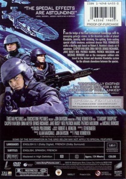 Johnny Rico (Casper Van Dien) and Carmen Ibanez (Denise Richards) are a high school couple approaching graduation, along with friends like flirty Dizzy Flores (Dina Meyer) and psychic Carl Jenkins (Neil Patrick Harris). Carmen decides to join the Federal Service, Johnny also joins, which upsets his father, Bill (Christopher Curry). Bill is convinced that Johnny’s teacher in History and Moral Philosophy, Jean Raczak (Michael Ironside), has influenced Johnny’s decision because only people who enlist in Federal Service for at least two years become true “citizens” with the right to vote. Johnny, Carl and Carmen join the Federal Service and go separate ways. Carmen enters pilot training because of her mathematical ability. Carl, because of his psychic ability, ends up in Military Intelligence. Johnny, because he has no other qualifications, enters training in the Military Infantry. Training involves tough Career Sergeant Zim (Clancy Brown), new friend Ace Levy (Jake Busey) and other people, plus another recruit from Johnny’s past. Johnny is deployed and meets an overwhelming Bug enemy. Battles are fought, won and lost, friends come and go, soldiers live and die. Johnny’s military career teaches him the value of citizenship and how a vote is truly defined.