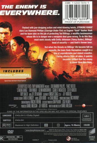 The movie Striking Range is about a guy named Vash (Lou Diamond Phillips) who does gun for hire type work. He and his team Mabe (Scarlett McAlister), Kilmer (Jeff Speakman), and John Hatem (Tom Wright) accept a bodyguard job to protect Ted Billings (Glenn Morshower) from the bad guys. He has to work with his old girlfriend, Emily (Yancy Butler), who is the head of security for Ted’s business. However, they were told something different about this job and Vash does not have all the facts. He goes looking for the facts and finds a major weapon of mass destruction - a ray gun that Ted wants to sell on the black market. What follows is trying to get the weapon back by any means possible. There is only one code that they must live by, which is not to take a bullet for the client.