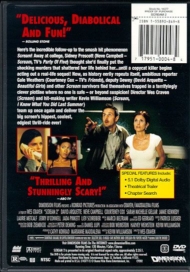 Two years have now passed since the tragic events of the first Scream move. In typical Hollywood fashion, the bestseller 'The Woodsboro Murders', written by hack journalist Gale Weathers (Courteney Cox), is being turned into a would-be blockbuster film. The Ghostface killer, however, is not at all happy about this. When two students are killed at the first screening of the film 'Stab', it becomes clear that the cycle of death is about to start all over again. Sidney Prescott (Neve Campbell) and Randy Meeks (Jamie Kennedy) are now regular students at Windsor College, while Cotton Weary (Liev Schrieber) - imprisoned by mistake by an overzealous prosecutor - is trying to get recompense for his time in jail. Dewey Riley (David Arquette) comes to protect Sidney, his 'surrogate sister', from the rising body count. But Sidney needs no one's protection and is anxious for revenge!