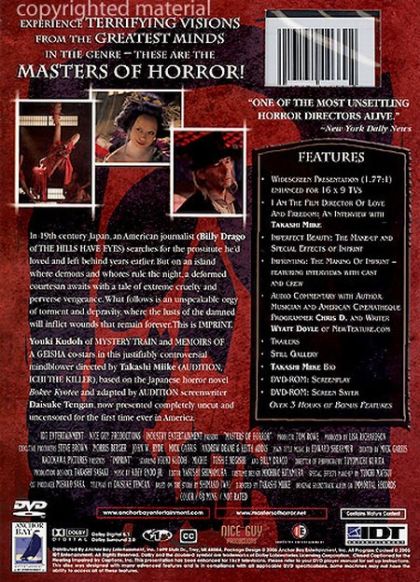 Anybody familiar with Miike's films (Audition, Visitor Q) knows a couple of things about him: (1) there is no affront against civilized behavior he won't put on film, and (2) he's a heckuva filmmaker. Imprint confirms this, on both counts. The only weak spot is the English dialogue reading by the Japanese cast--and by Billy Drago, for that matter, although he does look very cool. The story may or may not make sense, but what stays with you are the pregnant, eye-filling images (cinematography by Toyomichi Kurita) and the truly shocking violence. It is really what the Masters of Horror series seems designed to do: give a director complete freedom to merge style with story. Take this to heart, oh ye of low nausea thresholds: Imprint will seriously mess you up. --Robert Horton